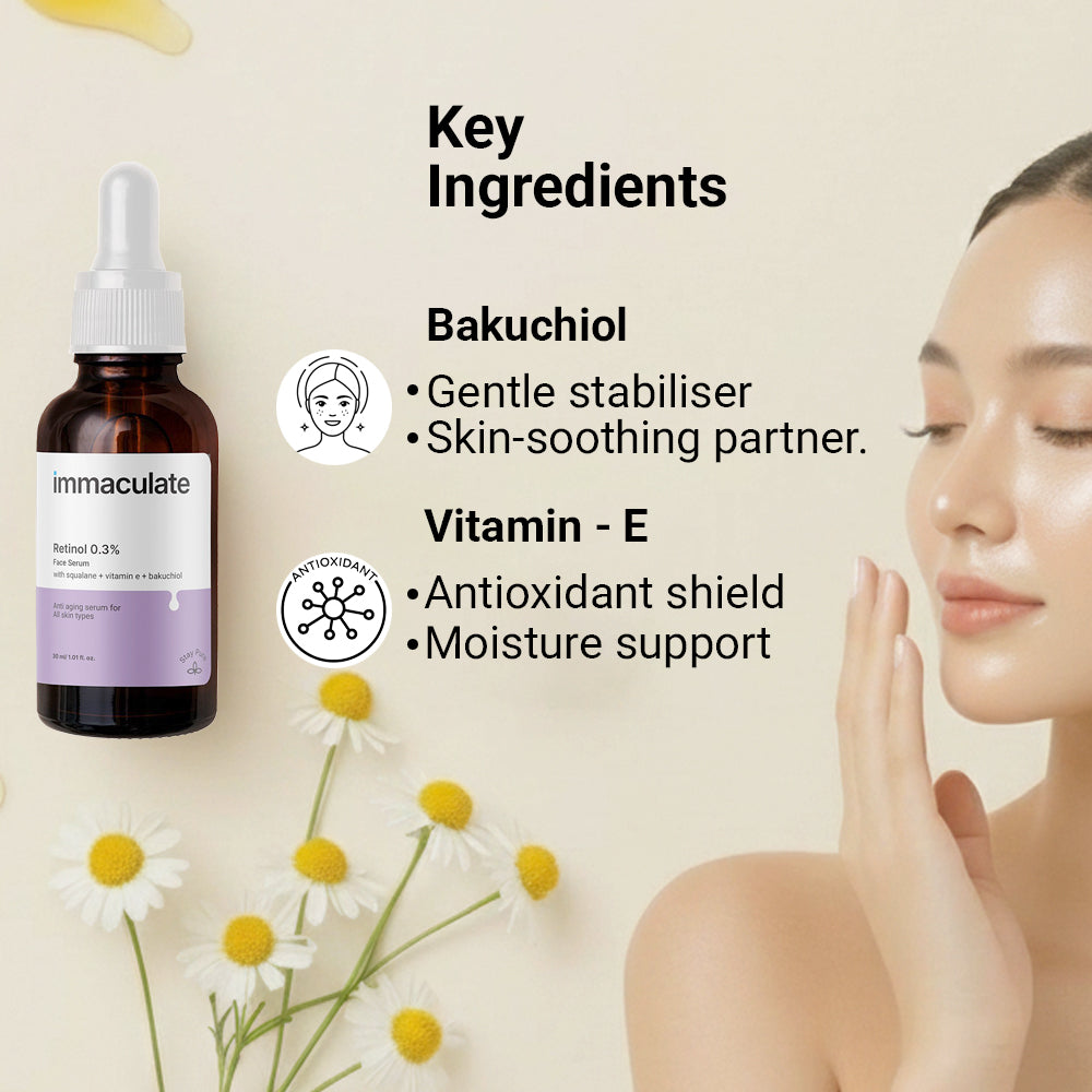Bakuchiol complements retinol’s effects by stimulating collagen synthesis, while Squalene reinforces the skin barrier and Vitamin E provides antioxidant protection.